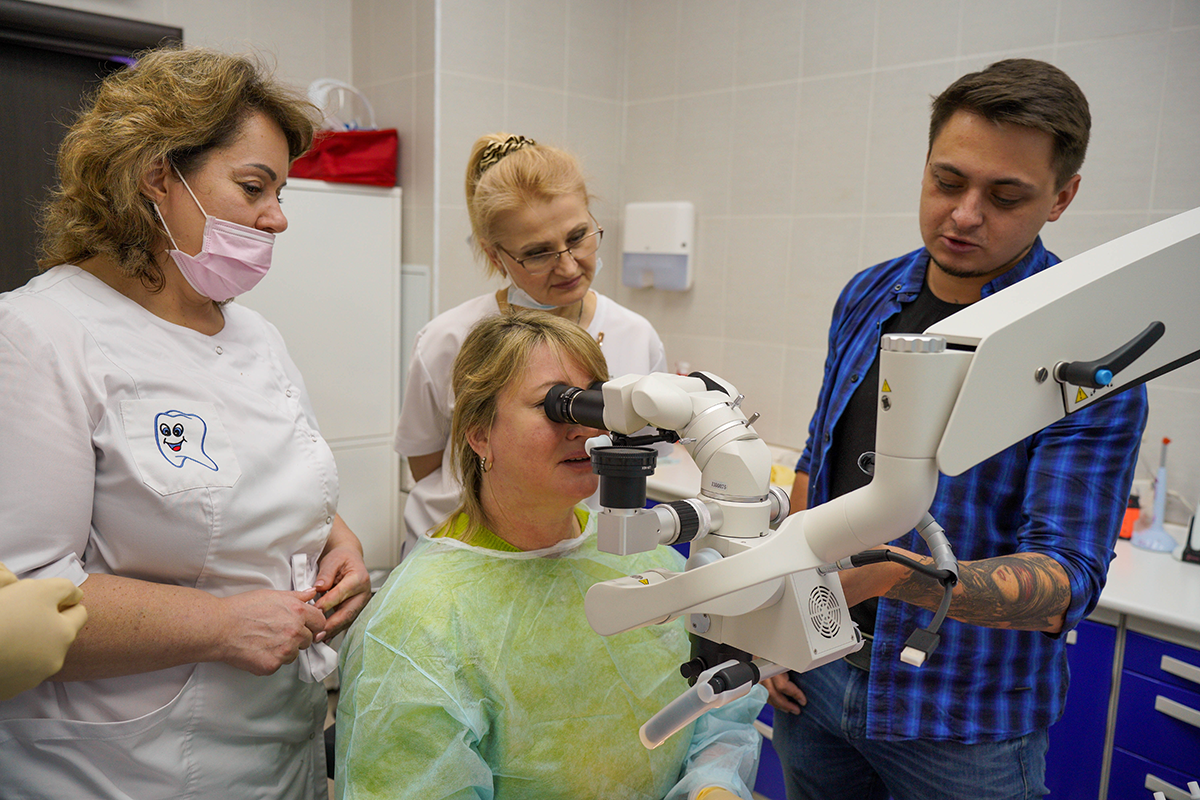 Всё просто: наш менеджер привёз инновационный стоматологический микроскоп GreenMED C-Clear, установил его и провёл обучение, на котором рассказал о всех нюансах взаимодействия с новым операционным помощником.