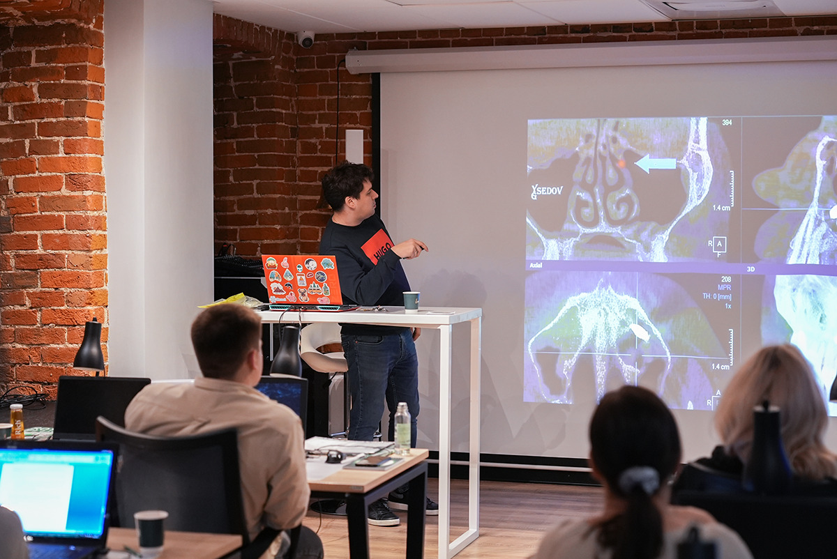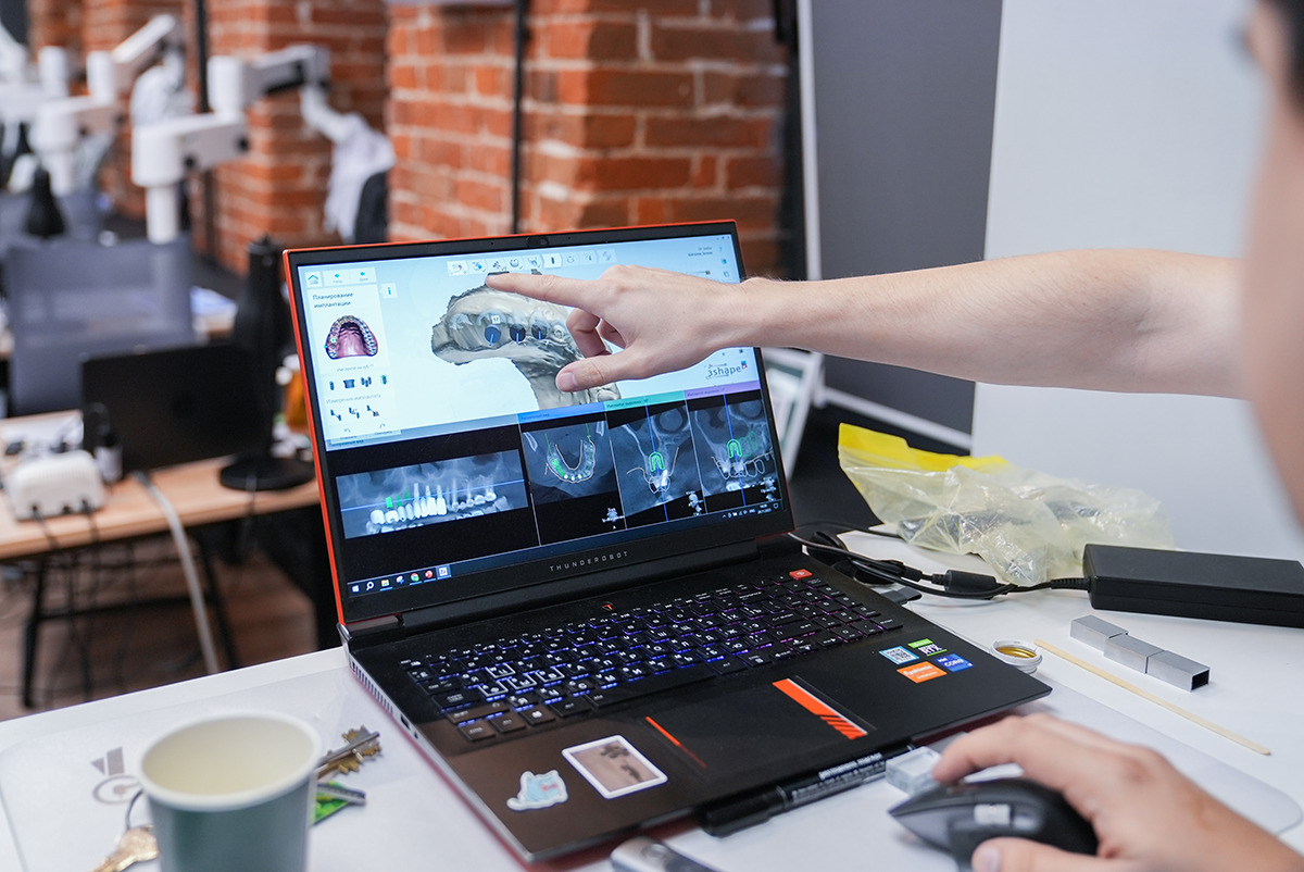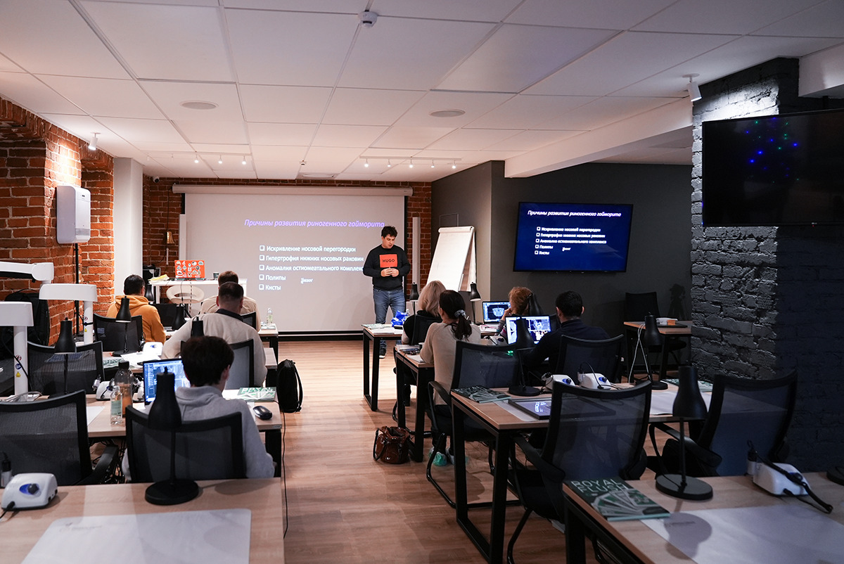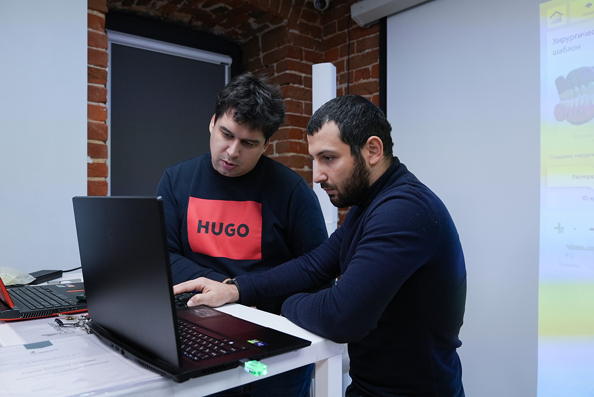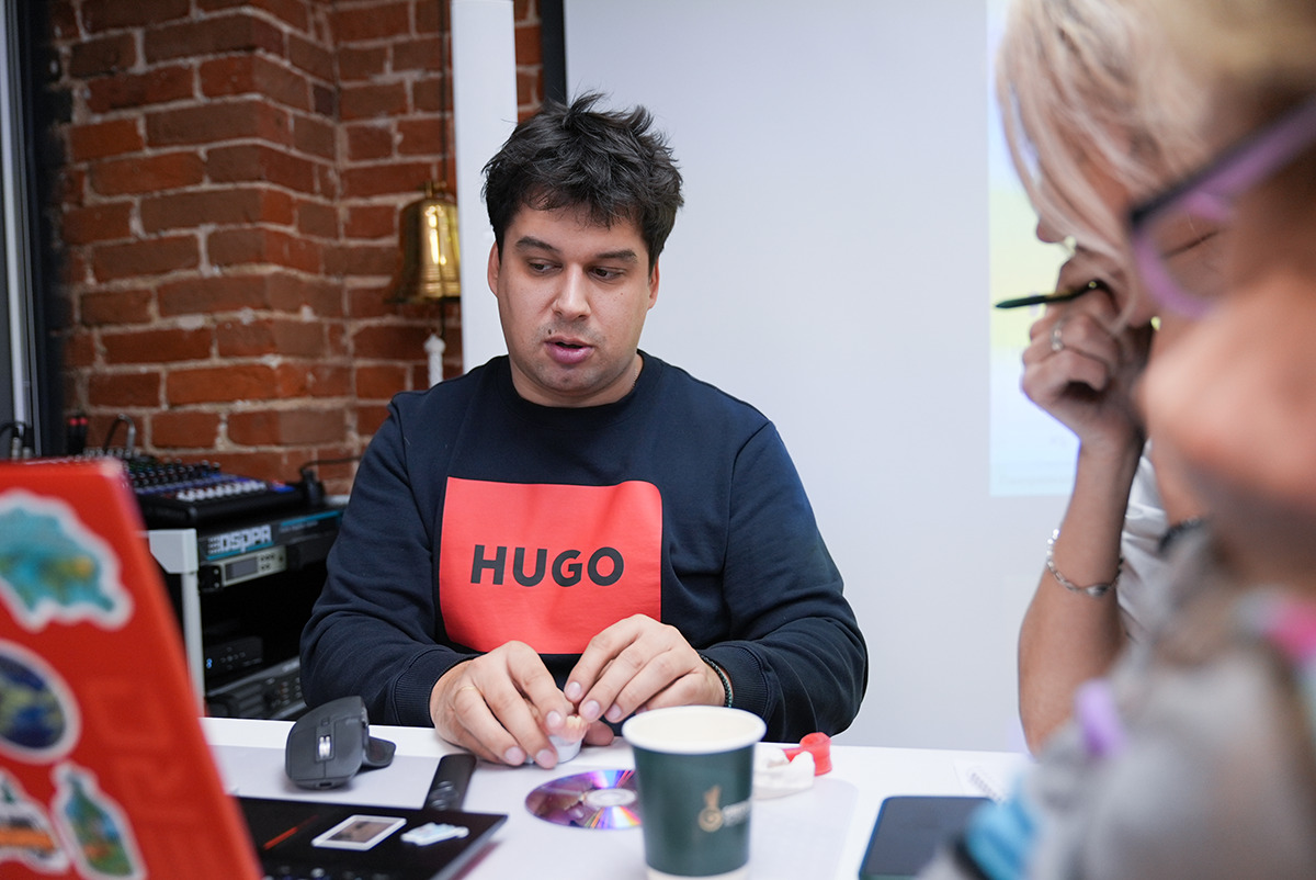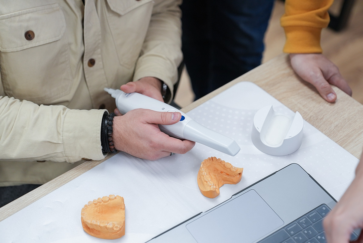 Руки держат высокоскоростной интраоральный сканер Medit i700, глаза направлены на снимок, где видна каждая деталь сканированной области, а уши улавливают новую информацию о рентгенологическом сопровождении дентальной имплантации  – это то, что чувствует каждый участник курса Юрия Седова.