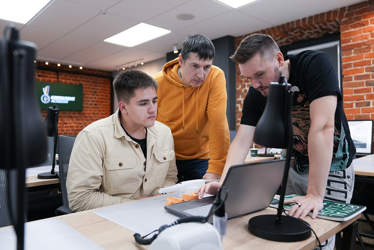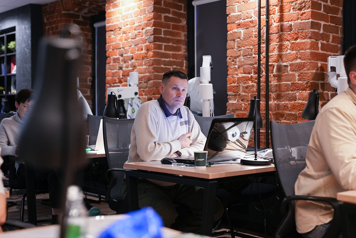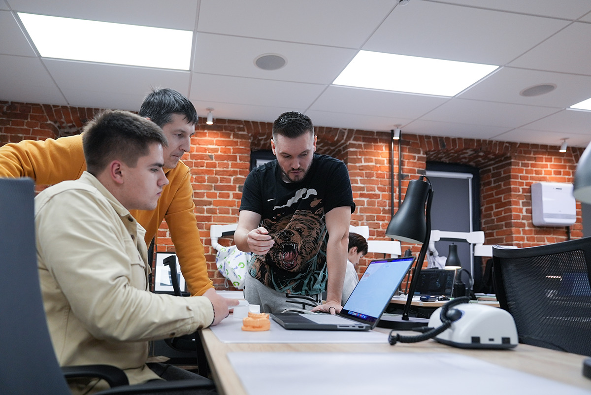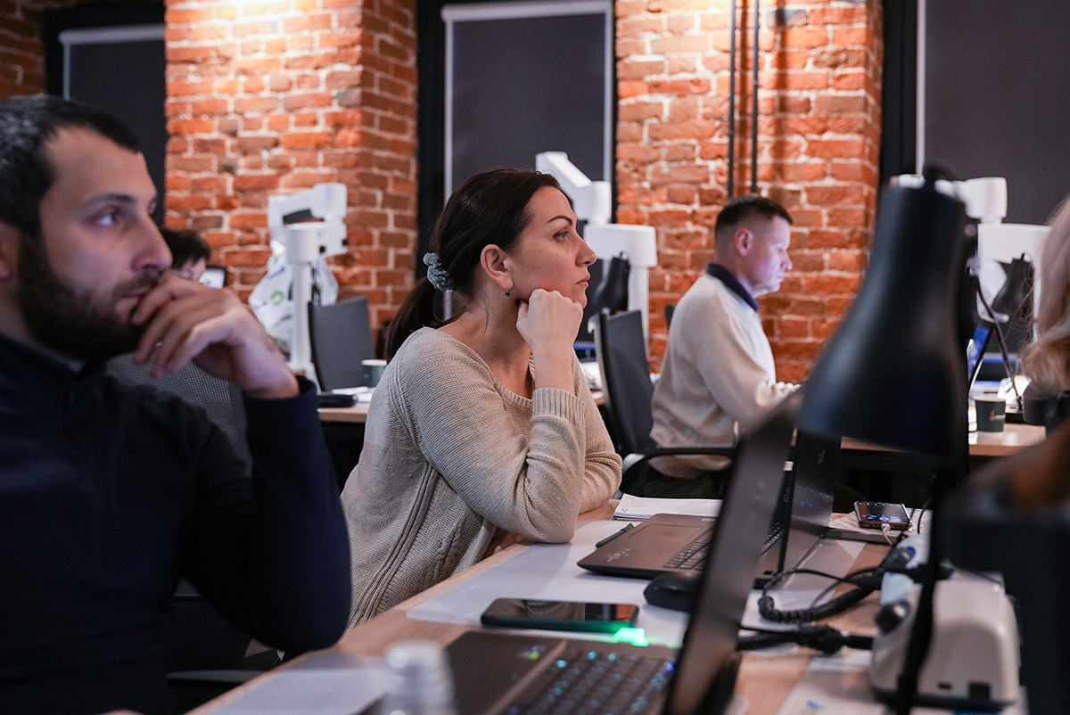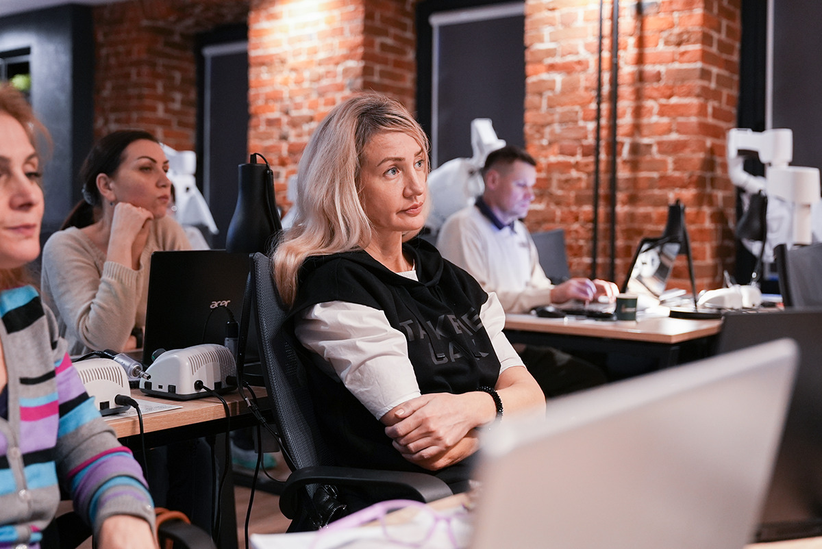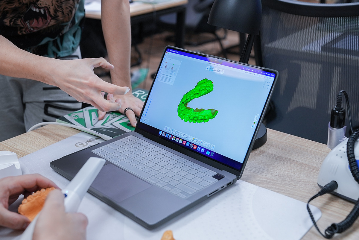 Руки держат высокоскоростной интраоральный сканер Medit i700, глаза направлены на снимок, где видна каждая деталь сканированной области, а уши улавливают новую информацию о рентгенологическом сопровождении дентальной имплантации  – это то, что чувствует каждый участник курса Юрия Седова.